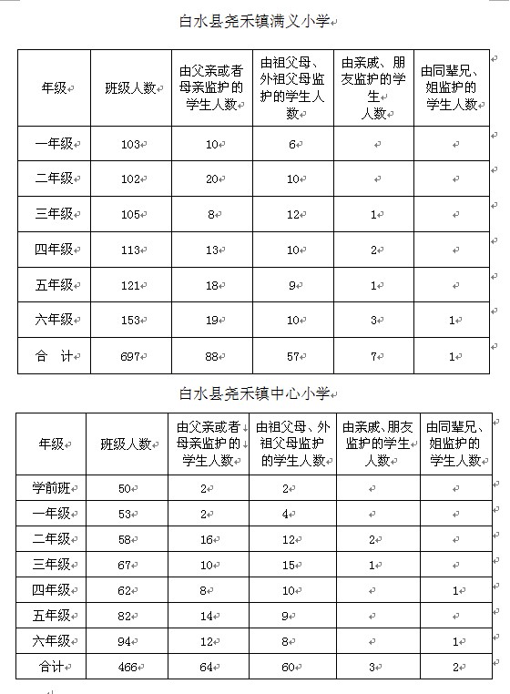 针对农村留守儿童的监护问题,笔者以白水县人口相对密集的尧禾镇中心小学、白水县尧禾镇满义小学为研究对象进行调查和研究,白水县地处关中平原与陕北高原的过渡地带,是渭南市唯一的山区县,属国家扶贫开发工作重点县,全县总面积986平方公里,恰好是国土面积的万分之一,辖7镇3乡194个行政村,总人口30万。白水县尧禾镇满义小学学生共计697名,留守儿童153名,占全校学生总人数的22%,其中由父亲或者母亲监护的88人,占留守儿童总人数的58%,由祖父母、外祖父母监护的57人,占留守儿童总人数的58%,由亲戚、朋友监护的7人,占留守儿童人数的4%,由同辈兄、姐监护的1人,占留守儿童人数的1%;白水县尧禾镇中心小学学生共计466名,留守儿童129名,占全校学生总人数的28%,其中由父亲或者母亲监护的64人,占留守儿童总人数的60%,由祖父母、外祖父母监护的60人,占留守儿童总人数的47%,由亲戚、朋友监护的3人,占留守儿童人数的2%,由同辈兄、姐监护的2人,占留守儿童人数的1%。