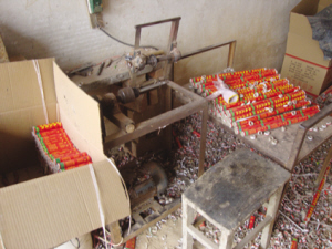 11月27日,富平公安局薛镇派出所民警在走访群众过程中了解到:薛镇北李村李某家有人非法生产烟花爆竹。得到这条线索后,薛镇派出所所长程宏 刚带领民警迅速出警,对李某家进行了突击检查。当民警到达李某家时,有两名中年妇女正在后院非法生产花炮,当场查获价值2000余元的“电光双 响”13000余头。随后,民警对爆竹及引线进行了扣押,并口头传唤违法行为人同某、王某到派出所接受调查。