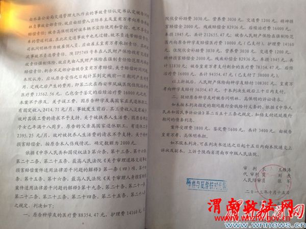 记者看到,这是白水县人民法院作出的两份同一文号的《民事判决书》,文号都是“(2013)白水民初字第00317号”,时间均为2013年10月15日,页码均为7页,审判长为王维涛,案由是一起机动车交通事故责任纠纷。两份判决书的原被告、案由均一致,但最后一页的赔偿标准却出现了差异。一份判决书显示人民财产保险赔付108301元,皇甫万孝赔付56354.47元,鉴定费1600元。而另一份判决书则显示人民财产保险赔付102241元,皇甫万孝赔付62414.47元,鉴定费2700元。