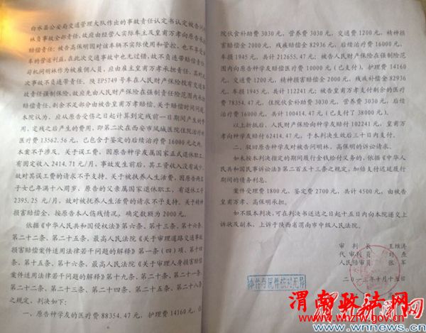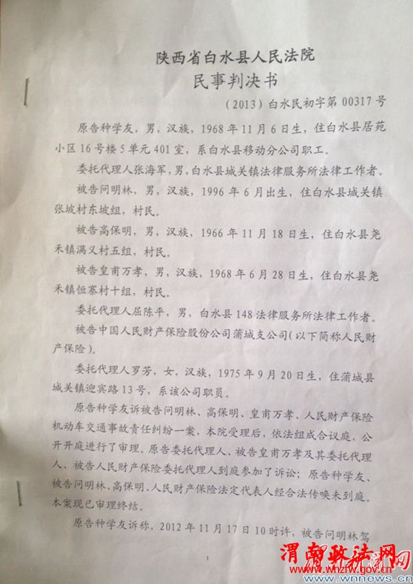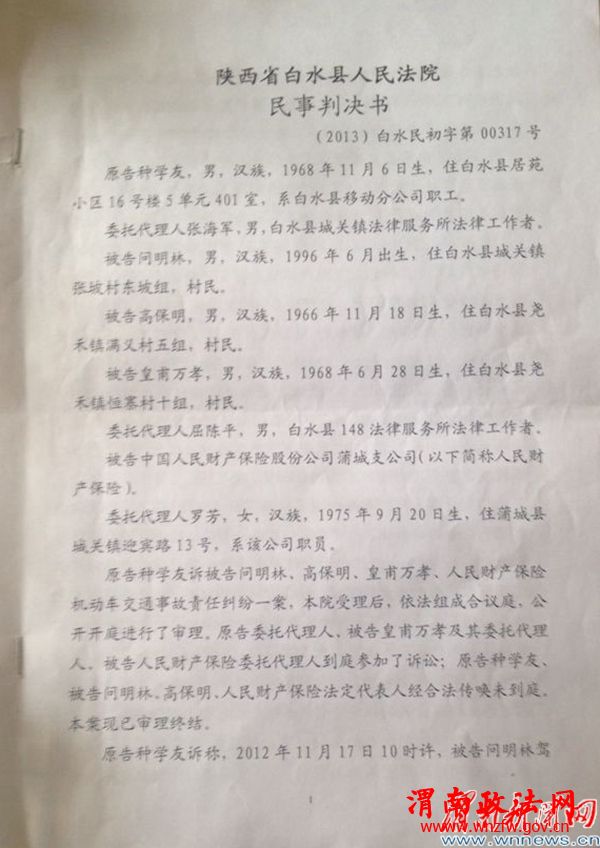 白水县人民法院纵目法庭开庭审理了此案。10月15日,白水县人民法院下发了《民事判决书》,判决被告人民财产保险向种学友赔付108301元,被告人之一皇甫万孝向种某赔付56354.47元。