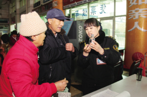 1月8日,在渭南火车站候车大厅进站口,火车站派出所民警告诉旅客不明液体禁止携带上车。