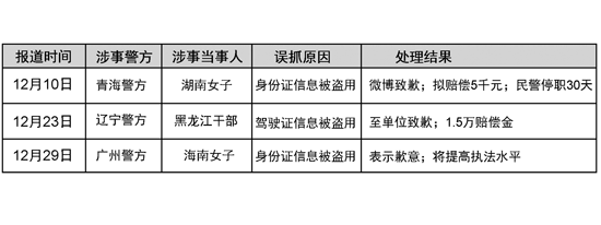 无独有偶,12月23日,媒体报道的黑龙江一名干部遭辽宁警方跨省误抓事件再度引发舆论关注。《法制晚报》报道称,19日,黑龙江省一名干部被辽宁警方上网通缉,在单位被戴上手铐抓走,最终辽宁警方证实当事人身份信息被盗用,承认通缉错了人。22日,发布通缉信息的辽宁警方到被错抓者的单位正式道歉,为错抓者恢复名誉,并向其支付了1.5万元的赔偿金。