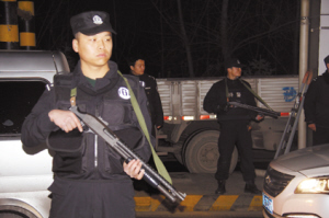 3月6日晚,富平县公安局巡特警在高速收费站武装设卡巡逻检查。