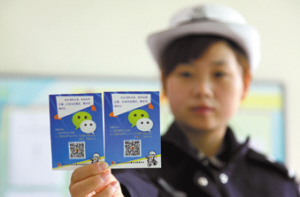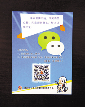 4月18日,临渭交警大队民警展示制作好的“渭南交警临渭大队”微信公共平台卡片。