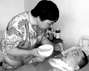 母亲正一勺一勺把稀粥喂进儿子嘴里。