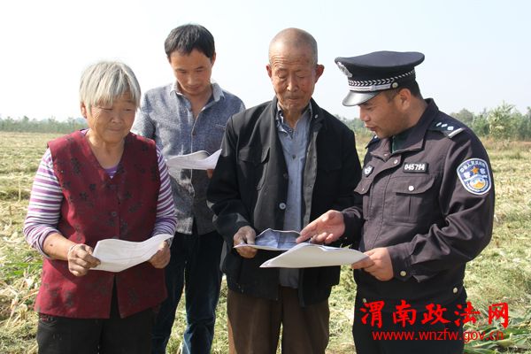 10月14日,富平县公安局淡村派出所民警正在辖区田地里向群众讲解秸秆禁烧的有关法规。富平县今年秋粮种植面积达64万亩。秋收秋播以来,为给广大农民 创造良好的秋收环境,富平县公安局基层派出所民警深入农户家中、田间地头,向群众进行秸秆禁烧宣传,提高农民群众对秸秆禁烧、减少环境污染的认识,掐断了 焚烧秸秆的源头,防止了因焚烧秸杆引发火灾以及农村道路交通安全事故发生。