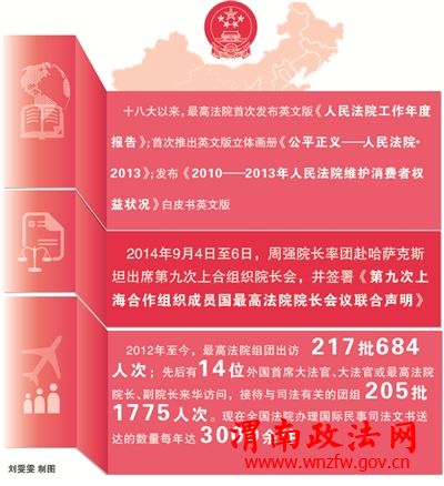 据了解,2012年至今,最高法院组团出访217批684人次,出席了上合组织院长会、亚太首席大法官会议、国际最高行政法院协会理事会、国际女法官协会年会等重要多边国际会议;地方各级法院共组团出访331批3578人次;受最高法院邀请,先后有14位外国首席大法官、大法官或最高法院院长、副院长来华访问,接待与司法有关的团组205批1775人次。