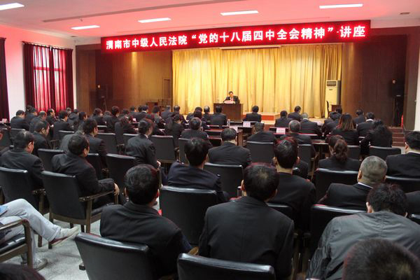 11月28日上午,渭南中院举办了“党的十八届四中全会精神”专题讲座,进一步组织法官干警深入学习《中共中央关于全面推进依法治国若干重大问题的决定》。市委宣讲团成员、渭南中院副院长傅桥舟同志精心授课,为全体法官干警认真解读《中共中央关于全面推进依法治国若干重大问题的决定》。渭南中院领导班子成员及全体法官干警共计120余人认真聆听了傅桥舟副院长的精彩授课。