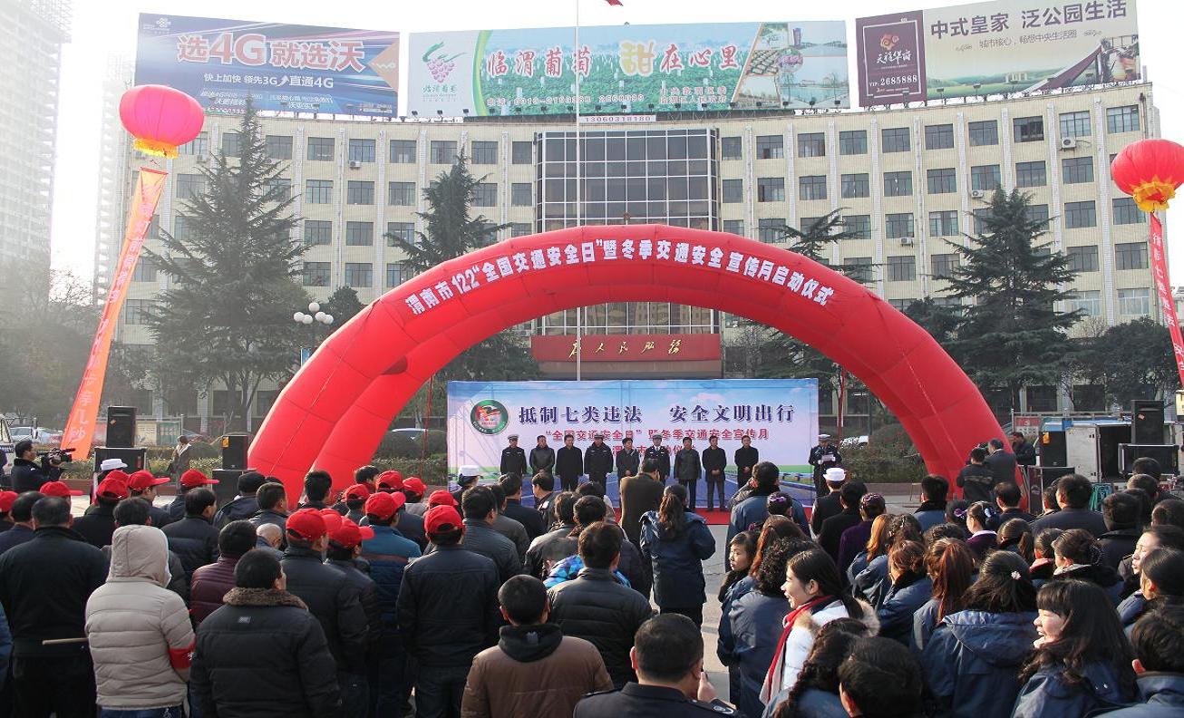 12月2日上午,渭南支队在市中心广场举行了声势浩大的122“全国交通安全日”暨冬季交通安全月启动仪式。小学生、驾校学员、公交公司和客运公司客运驾驶人、危化品运输公司货运驾驶人、市区志愿者、民警代表共约600余人参加了启动仪式。渭南市委宣传部副部长、市文明办主任李永朝、市安监局副局长王培兴、市文化市场综合执法支队支队长吴会民、市文明办活动科科长颜明奇、市交通局安全科科长和百灵、市教育局安稳科科长吴小虎及市公安局交警支队政委智建峰、副政委张龙、副支队长兼临渭大队大队长闫丰胜、高新分局副局长兼高新交警大队大队长田军出席了主会场启动仪式。