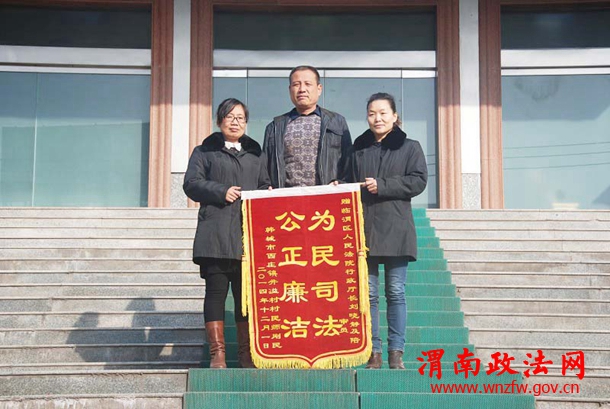 2014年12月8日上午临渭区法院门口鞭炮齐鸣,家住陕西省韩城市西庄镇井溢村一组村民师刚民一大早就赶来临渭区法院,送来一面“为民公正,司法廉洁”的锦旗。感谢临渭区法院行政庭法官坚守公平正义,为案件的审理付出的辛劳和努力。