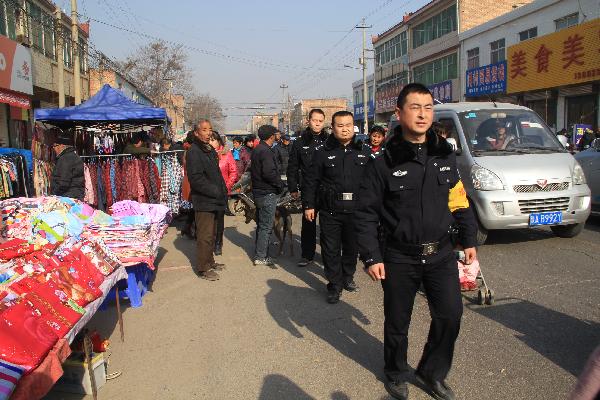 1月3日,时逢闫村镇集会,三张派出所成立专职集会巡逻队,由副所长许菲带领,统一配带黄袖标和单警装备,前往集会市场进行治安巡逻,并向群众、商贩宣传安全防范常识,提醒群众保管好随身财物,放置好摩托车、电动车、自行车。看到巡逻民警,老百姓纷纷表示“感到心里很踏实”。