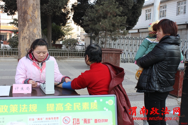 据统计,悬挂宣传条幅 6条,制作展板3块,制作光盘2套,出动宣传车2台次、宣传人员20人次,发放了渭南市政府《两非》通告1500余份,潼关县政府《两非》通告1500余份。现场讲解“什么是两非行为的范围”、“如何监督举报两非行为”,发放宣传资料“关爱女孩 行动起来”1000余份、“让生活更美好”1000余份。服务站工作人员现场为过往的群众测量血压100人次,发放了计生围裙200条、复方苦参洗剂200盒、壬苯醇醚栓400盒、避孕套400盒。