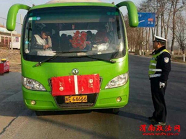 1月22日上午,临渭交警大队固市中队民警在执勤中,发现一前玻璃贴有喜字的大客车超员,民警上前询问时,客车驾驶员说是结婚车辆,民警发觉该车驾驶员回答问题时含糊不清,眼神闪烁其词,行为很可疑,再三追问下原是驾校学员去考试,民警在对其进行教育后依法处理。