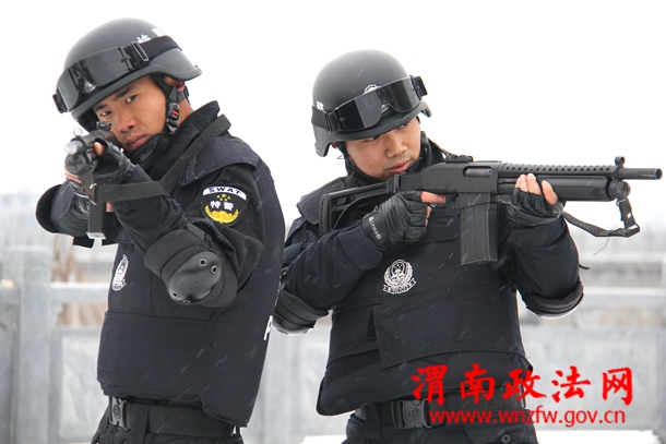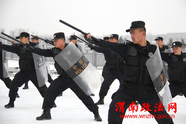 富平县公安局巡特警大队队员正在风雪中进行大练兵