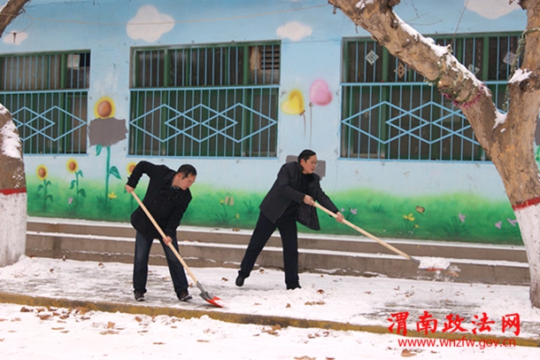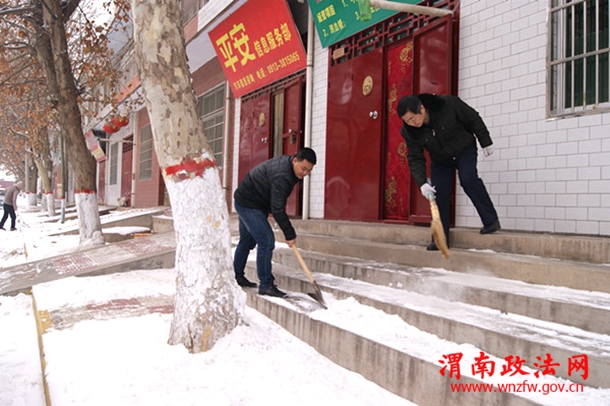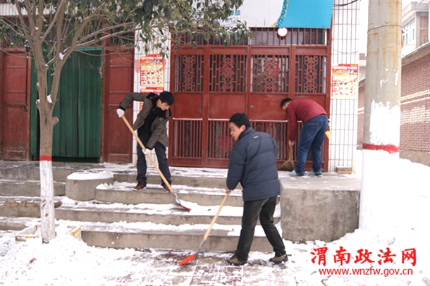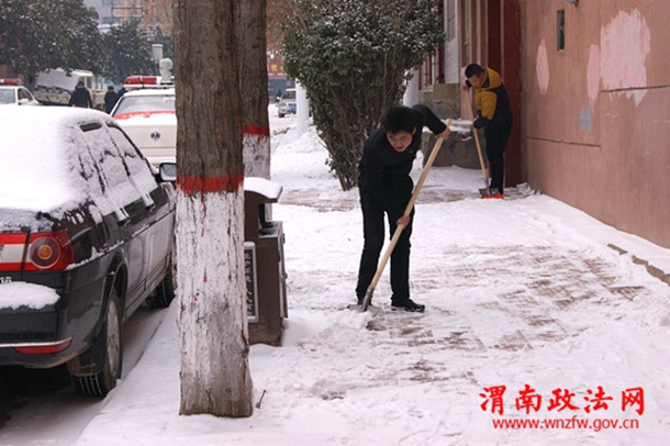 潼关法院法官干警在清扫包联路段上的积雪