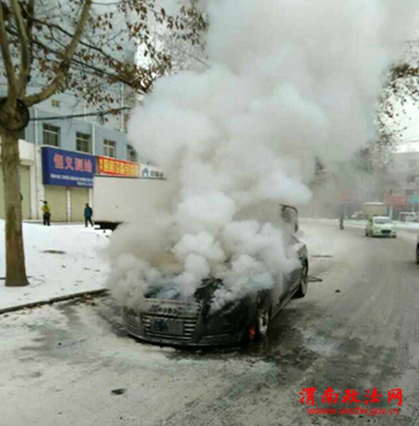 附近执勤的临渭交警大队民警迅速赶赴现场,同时拨打119,现场一辆奥迪小轿车正在燃烧,无人员被困,火势处于猛烈燃烧阶段,现场浓烟滚滚,民警立即疏散围观人员,对交通进行疏导,随后消防车顺利到达现场,将火扑灭。