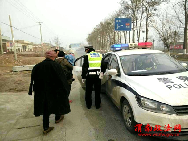 2月1日早,临渭交警大队固市中队民警在G108检查站执勤时,一辆红色小轿车被查时驾驶员神情慌张,且未能出示机动车驾驶证,民警马上意识到该驾车人有无证驾车的嫌疑,当告知当事人需去中队接受进一步调查时,车上一位女士留着眼泪告诉民警,他们此行是带93岁高龄的父亲去医院进行心脏病治疗的,希望民警给予宽容,了解情况后,二班长潘磊立即派民警张亚楠、东晨辉驾驶警车将老人送往医院接受治疗,同时,将涉嫌无证驾车的驾驶人传唤至中队做进一步调查。