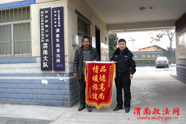 渭南政法网(特约通讯员 李社平 )2015年1月30日12时许,渭南站派出所门口响起阵阵鞭炮声,一名50岁左右的男子将一面写着“品德高尚、情暖旅途”的锦旗交到副所长唐武军手中,并紧紧拉着唐所长的手,连道感谢。