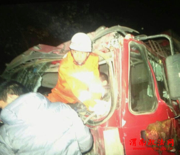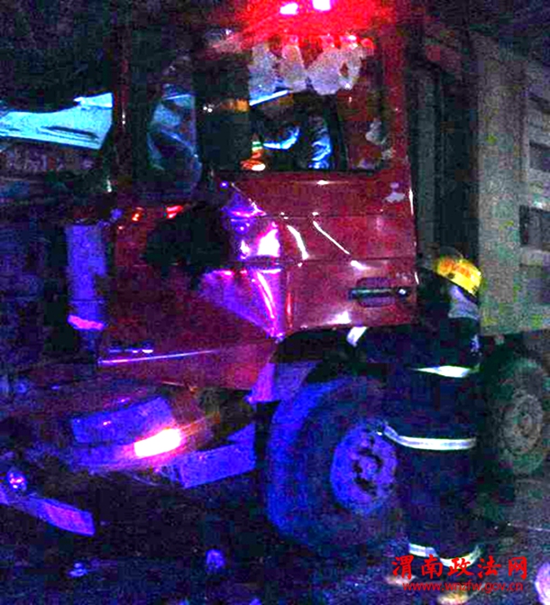2月8日6时许, 渭南市区南塘五岔路口西,两辆重型货车发生追尾,造成后车严重受损变形,驾驶员被卡在驾驶室内,无法挪动,经消防员成功解救,送往医院治疗,事故原因正在进一步调查中。