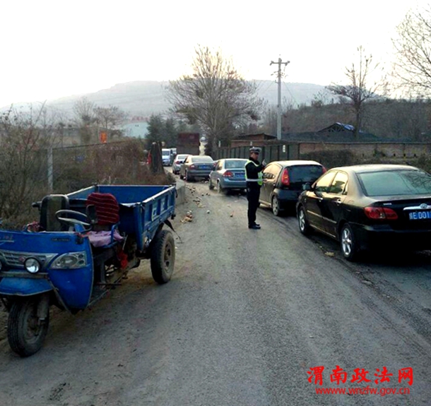 2月6日,渭南龙尾坡铁路桥口段两辆相向而行的三轮车因互不相让,导致相撞,所幸的是双方驾驶人员并无大碍。