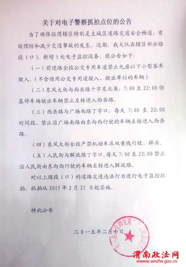 对以上路段(口)的道路交通违法行为进行电子监控抓拍,抓拍从2015年2月25 日起实施。