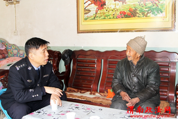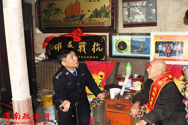 渭南政法网(特约通讯员 舒傲梅)今年是抗日战争胜利七十周年。2月13日,羊年春节前夕,韩城市公安局党委委员、政治处主任吴普学与政治处民警,代表公安局党委和全体公安民警,带上年画、米、面、油等慰问品,看望居住在韩城的4名抗战老兵,向他们带去韩城公安对他们为国家为民族做出贡献的崇高敬意和节日的慰问。