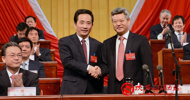 李明远以全票当选成为渭南市人民政府市长,市委书记、市人大常委会主任徐新荣与李明远握手表示祝贺。记者杨青山 张亨特摄