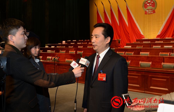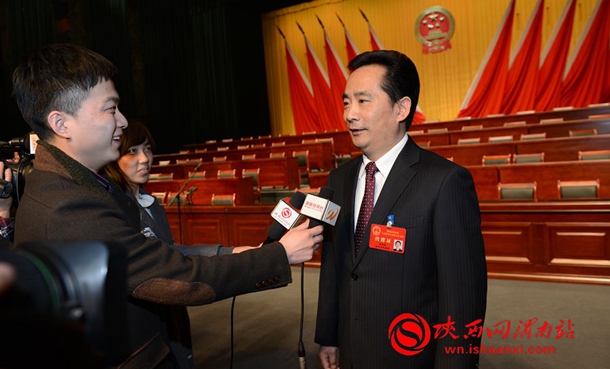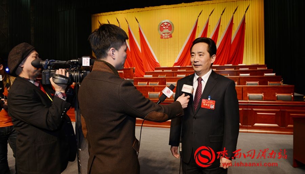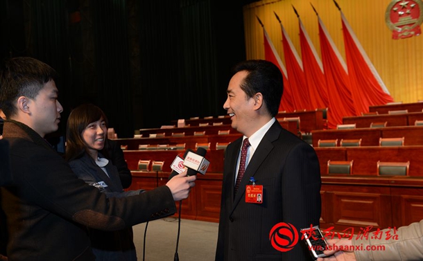 陕西网渭南站视频记者王丽华和渭南电视台记者在大会结束后采访新任市长李明远。记者杨青山 张亨特摄