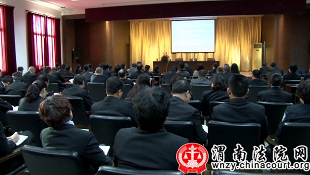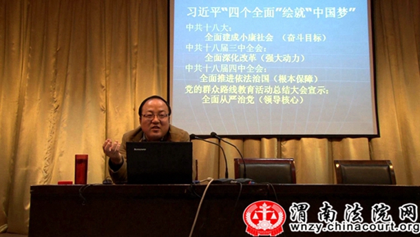 张亚锋教授以习近平总书记关于学习的论述开篇,从深刻领会习近平总书记十八大、十八届三中、四中全会以来系列重要讲话精神为主线,充分阐释了“四个全面”即全面建成小康社会,全面深化改革,全面推进依法治国,全面从严治党,绘就了实现中华民族伟大复兴的中国梦的路线图;并运用生动的事例,大量的数据,丰富的信息,从九个方面对新常态下的中国经济进行了阐述,使大家对中国经济新常态下的转型发展路径有了更加清晰的认识;结合渭南社会经济现状,就协调推进“四个全面”,抢抓战略机遇期,实现陕西东大门的跨越式发展,做了明了的解读。张教授的授课紧贴实际,具体生动,通俗易懂,丰富幽默,集知识性、理论性、思想性于一体,不时赢得全体法官干警的阵阵掌声。