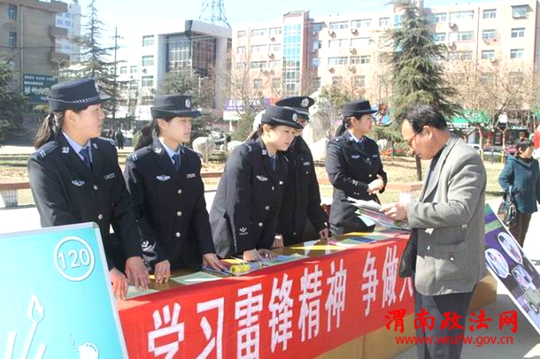 渭南政法网(特约通讯员 冯伟)2015年是开展“向雷锋同志学习”52周年,是第16个中国青年志愿者服务日。为进一步贯彻党的十八大、十八届三中、四中全会精神,传承和弘扬雷锋精神,推动学习雷锋活动和志愿者行动的深入持续开展,不断提升全局青年民警的思想道德建设和人民警察核心价值观教育活动,韩城市公安局成立了由60人组成的“韩城市公安局学习雷锋服务队”,从人民群众关注的小事、实事做起,加强法律法规、安全防范宣传等方面服务,着力构建平安法治韩城。