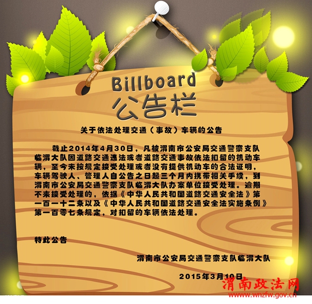 【公告 关于依法处理交通(事故)车辆的公告】截止2014年4月30日,凡被渭南市公安局交通警察支队临渭大队因道路交通违法或者道路交通事故依法扣留的机动车辆,至今未按规定接受处理或者没有提供 机动车的合法证明,车辆驾驶人、管理人自公告之日起三个月内携带相关手续,到渭南市公安局交通警察支队临渭大队办案单位接受处理。逾期不来接受处理的,依 据《中华人民共和国道路交通安全法》第一百一十二条以及《中华人民共和国道路交通安全法实施条例》第一百零七条规定,对扣留的车辆依法处理。