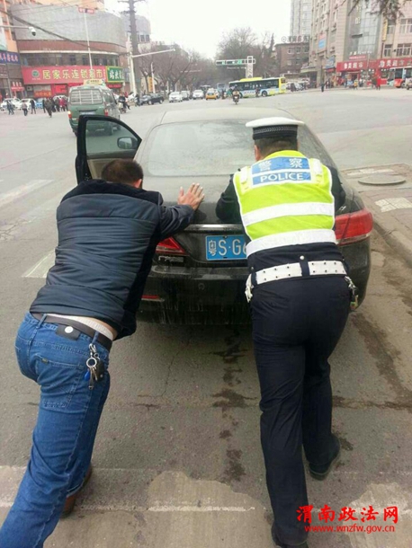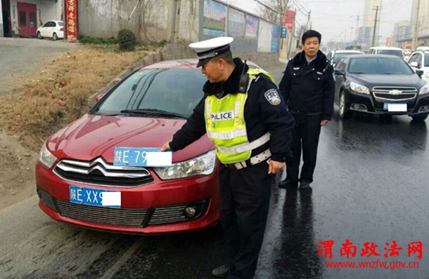 3月11日,临渭交警大队二中队接到指挥中心指令,一辆疑似假牌车辆,在华山大街由西向东行驶,二中队巡逻民警立即行动,在金水路口将该车拦截。