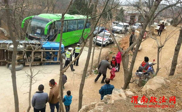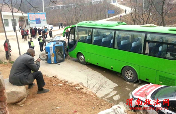 临渭交警大队闫村中队民警立即赶到事故现场查看得知,因三轮车下坡拐弯时未能控制好车速,撞向了停在一旁的旅游大巴上,所幸现场无人员伤亡,因事故现场属风景区,且路面较窄,人、车流量较大,导致该路段车辆行驶缓慢,民警迅速对过往车辆进行疏导,有效的预防了道路交通拥堵。