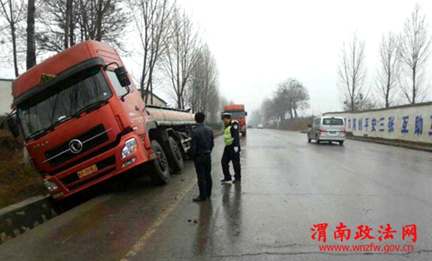 3月18日,天空还在任性的飘着雨,一辆危化品运输车在闫村107省道坡道处,因路面湿滑,驾驶难度大,在避让一辆摩托车时发生意外,车辆一侧陷入路边沟渠中,所幸没有造成大的损失,临渭交警大队闫村中队民警在发现此情况后立即上前询问并帮助驾驶人解决困难…