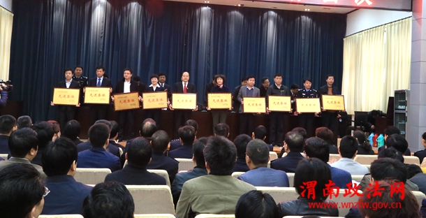为了表彰先进,弘扬正气,树立政法队伍良好形象,会上隆重表彰了2014年度先进单位和个人。蒲城法院喜获多项荣誉,被县委、县政府评为“平安建设先进集体”,行政庭、孙镇法庭、兴镇法庭被评为“人民群众满意的政法单位”,贺俊杰、李俊萍、张维三名同志被评为“人民群众满意的政法干警”。