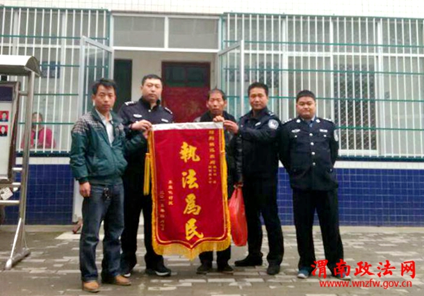 渭南政法网(特约通讯员李琦)2015年4月7日早上10时,一阵热闹的鞭炮声响彻蒲城荆姚派出所大院,荆姚镇东宣化村村民将一面“执法为民”的锦旗交到了荆姚派出所副所长胡翌手中激动的说:“感谢警察同志,你们真是老百姓的保护神啊!”