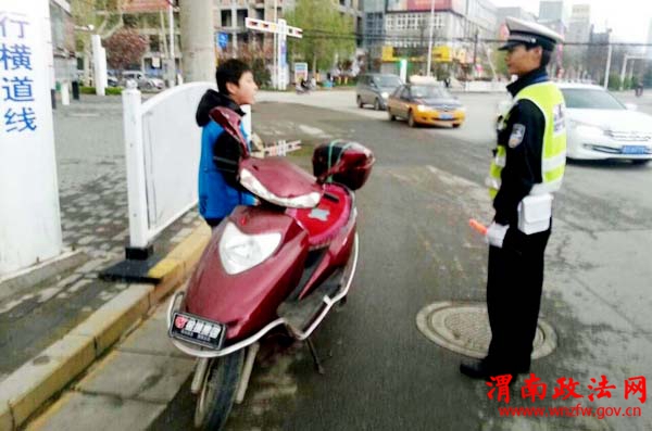 4月6日,临渭交警大队四中队民警看到一未成年人驾驶无牌摩托车,在将其拦挡后,民警耐心的从正反两面跟小朋友讲该行为的危险性,建议其以后可用自行车代步,生命宝贵,要对自己与他人的生命安全负责。