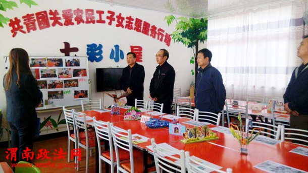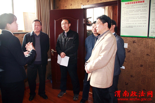 陕西省综治委“预青”督导组成员:综治办专职副主任胡跃宏,省综治办综治一处处长赵广和,团省委权益部部长、省综治委“预青”专项组办公室副主任崔梦社等10人,在潼关县委常委、政法委书记孙永亮和团县委等领导陪同下,实地察看了潼关中学“青春驿站”、县公安局三网合一指挥平台、城关镇团委、城关镇兴隆社区警务室、代字营镇万家岭完小“七彩小屋” 5个工作点。