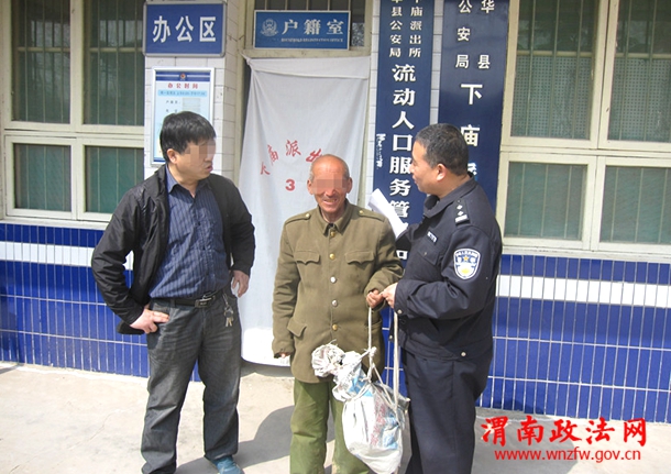 渭南政法网(特约通讯员 曹飞跃 王顺理)2015年4月9日晚上10时30分,华县公安局下庙派出所接到辖区什字村洗车场老板史某报警,称其门口有一位走失老汉,请求派出所救助。