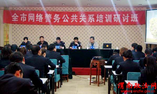 渭南政法网(特约通讯员 吝敏)2015年4月14日,渭南市公安局第一期网络警务公共关系培训研讨班在蒲城县公安局成功举办。市局政治部宣传处处长李跃、民警王海荣,蒲城县公安局党委副书记霍有利、政治处主任张轲杰及蒲城、富平和白水各科所队负责人、宣传业务骨干共计109人参加了培训,会议由宣传处处长李跃主持。