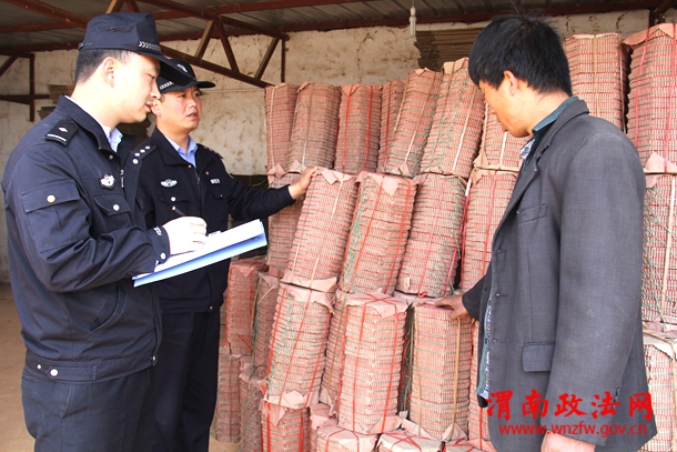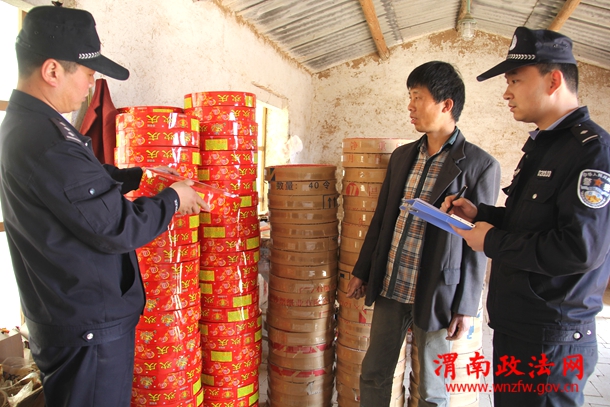 渭南政法网(特约通讯员 刘苍锋)陕西省富平县公安局组织民警深入烟花爆竹生产厂家,对烟花爆竹生产、储存以及仓库管理、公司安全管理制度落实情况等进行大检查,确保夏季烟花爆竹生产安全形势稳定。图为4月24日,老庙派出所民警正在对辖区一烟花爆竹生产公司进行安全检查。