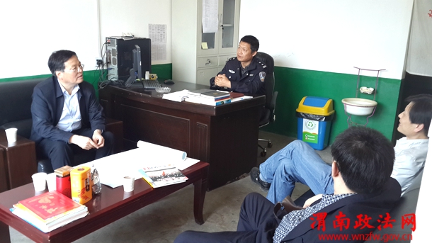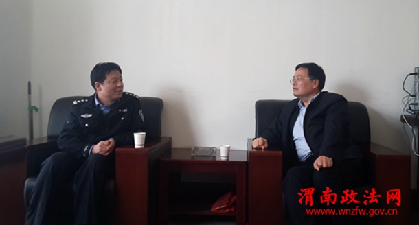 市委政法委副书记、市综治办主任贾重新和合阳县公安局坊镇派出所所长谭耀云座谈交流基层平安创建工作