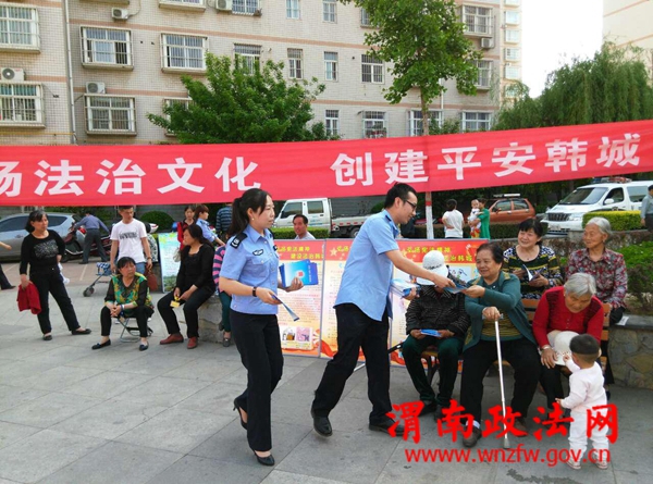 渭南政法网(特约通讯员 薛力军)4月28日下午,韩城市委政法委依托社区道德讲堂文艺演出活动,组织政法部门在司马社区开展了法治文化进社区宣传活动。活动以“弘扬法治文化.创建平安韩城”为主题,各政法部门制作了法治文化教育宣传板块40余块,印发法治建设宣传材料、六五普法图本、诉讼图解、法治与监督、科技强警、法治平安等约4000余份,政法干警与市民群众亲切交谈并一一解答市民咨询。