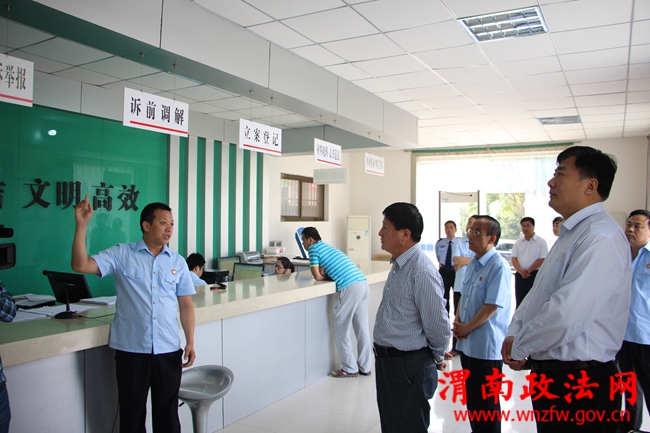 杨书记一行首先来到法院诉讼服务中心,该院立案庭庭长牛建民介绍了立案登记制施行后立案信访工作新的职能定位、功能设置和司法便民工作开展情况,当杨书记看到为当事人服务的诉讼指南资料、触摸查询电脑、同步音视频监控系统等灵活多样的便民服务和司法公开措施时,他高兴地说:“县法院改革创新动作快,硬件配置很到位,我们要和周边法院比服务水平、比办案质量”。