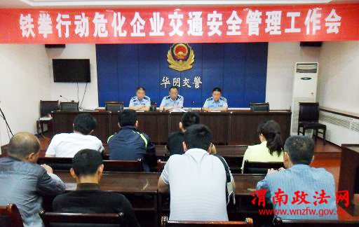 会议上,华阴大队特勤中队副中队长刘勇军同志首先通报了近期发生的几起重大道路交通事故,他从这几起事故发生的过程、形成的主要原因,深入浅出地分析了几次事故暴露出来的主要问题,以案说法,面对面地开展案例警示宣传教育。随后,中队长任军传达学习了“铁拳行动”有关文件精神要求及公安部关于严管严查危化企业交通违法行为的先进管理经验。最后,副大队长董东通报了“5.15”陕西淳化发生的重特大道路交通事故情况,详细分析了近期交通安全所面临的严峻形势,并就贯彻落实好此次会议精神提出了如下具体要求:一是思想认识、责任落实要到位。各危化企业负责人要充分认识当前交通安全面临的严峻形势,切实提高认识,时刻绷紧安全这根弦,做到警钟常鸣,并要确定专人负责交通安全,落实安全生产主体责任,加强运输车辆安全监管,抓好隐患排查,确保安全与效益均实现双赢。二是强化路面管控。要求特勤中队做为危化品运输的监管单位,要进一步加大路面监管力度,严查严处各类危化品交通违法行为,对严重交通违法行为坚决做到严执法,零容忍。三是认真传达落实好此次会议精神。今天参会的人员回去后,一定要将会议的内容和精神原原本本地汇报给各自企业负责人,切实要引起负责人的高度重视,也很有必要把会议精神传达到企业管理人员和每一个驾驶员。并且企业内部要细化措施,切实整改,与监管部门紧密配合,共同努力,为彻底扭转道路交通安全管理工作被动局面做出应有贡献。