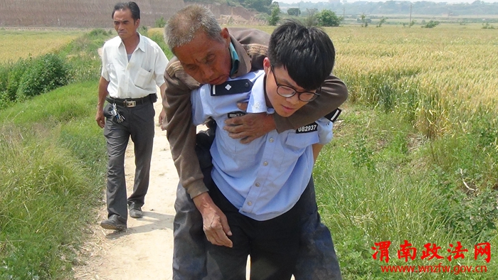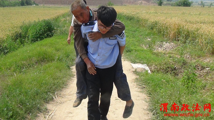 渭南政法网(特约通讯员王勇)2015年5月27日上午,王寮派出所接到群众报警,称在卤川村南阳水库边发现一受伤的老人。王寮派出所民警赶到现场后,发现一名老年男子虚弱地躺在水库边的草丛里,表情痛苦,但面对民警的询问,老人却无法说其姓名和住址,发现老人腿部有伤后,民警毫不犹豫地蹲下身子,将老人背起,但从水库到警车距离大概要200米,还要爬一个将近50米长的土坡,但民警没有叫苦叫累。将老人从水库边背到警车后,民警随后又和县救助站联系,将老人送往县第二人民医院救治,经医生诊断老人腿部骨折,目前,老人仍在进一步治疗当中。