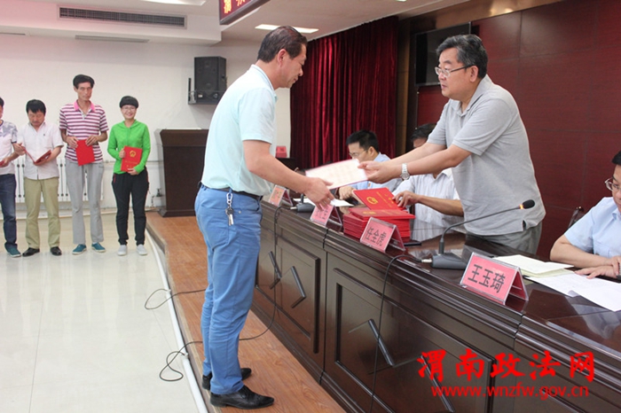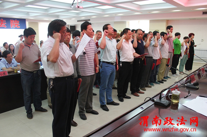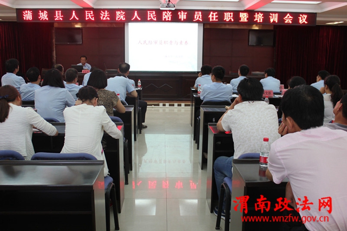 2015 年5月29日上午,蒲城县第十七届人大常委会第二十五次会议研究通过了蒲城法院院长王玉琦提请拟任44名人民陪审员的议案。因为人数众多,经人大常委会同 意,委托在我院对部分新任命人民陪审员颁发任命书、组织向宪法宣誓。在今天的任职暨培训会上,首先由县人大人代委主任姜新民宣读人民陪审员任职的决定,县 人大常委会副主任任全虎向新任人民陪审员颁发了任命书,县人大法工委主任张忙生带领新任命的人民陪审员向中华人民共和国宪法郑重宣誓。随后由法院副院长原 广平同志讲解、学习最高人民法院、司法部关于印发《人民陪审员制度改革试点方案》的通知,由纪检组长苏宏盛同志讲解《人民陪审员职责和司法礼仪》。