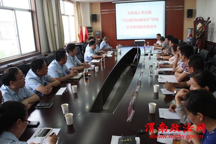 渭南政法网(特约通讯员刘 媚)为进一步扎实开展“司法 规范化建设年”活动,6月10日,合阳法院邀请该县部分执业律师和县司法局有关领导召开了座谈会,征求他们对司法规范化和法院工作的意见和建议。院长饶秦 军、副院长王俊峰、宁卫中、柳红省、王永红及部分庭室负责人参加会议。会议由副院长王俊峰主持。