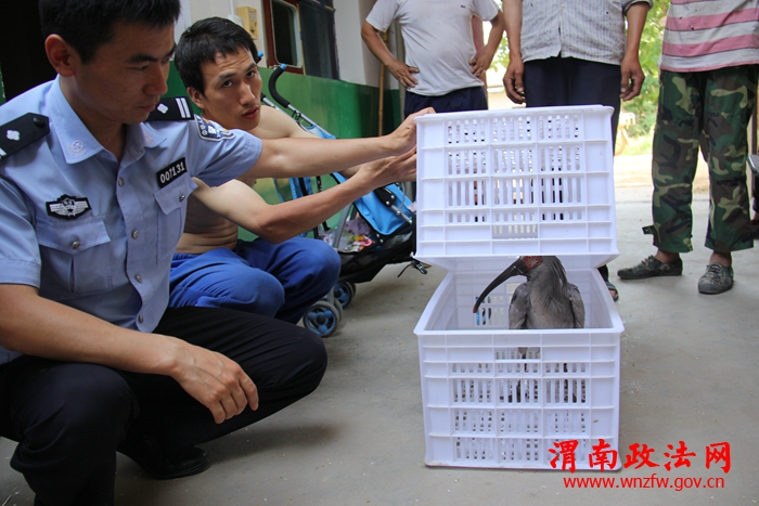 渭南政法网(特约通讯员翟俊)6月9日下午,宫里派出所接到宫里镇北陵村六组刘守娃报警,称其家中发现一只长相奇特的鸟,疑似国家一级保护动物朱鹮,为了保护该鸟,请求公安机关帮助。接