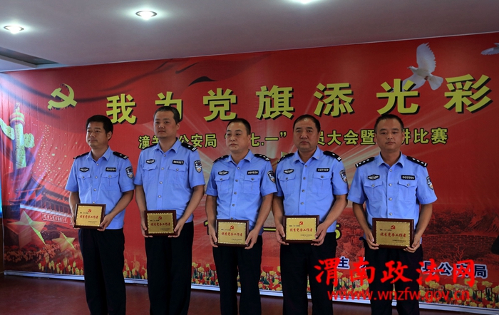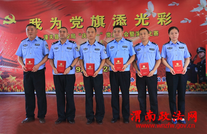 潼关县公安局常务副局长庞建良主持庆祝活动,副局长张玉龙宣读了表彰先进基层党组织、优秀党务工作者和优秀共产党员的决定;工会主席、政治处主任郭力生同志宣读了中共潼关县公安局委员会关于任磊等三名同志预备党员转正的批复、关于接受于江等五名同志为中共预备党员批复;副政委孙文革带领五名新接收的预备党员举行了预备党员入党宣誓仪式和老党员重温入党誓词。表彰先进会上,先进基层党组织、优秀党务工作者、优秀共产党员等14名代表上台领奖。